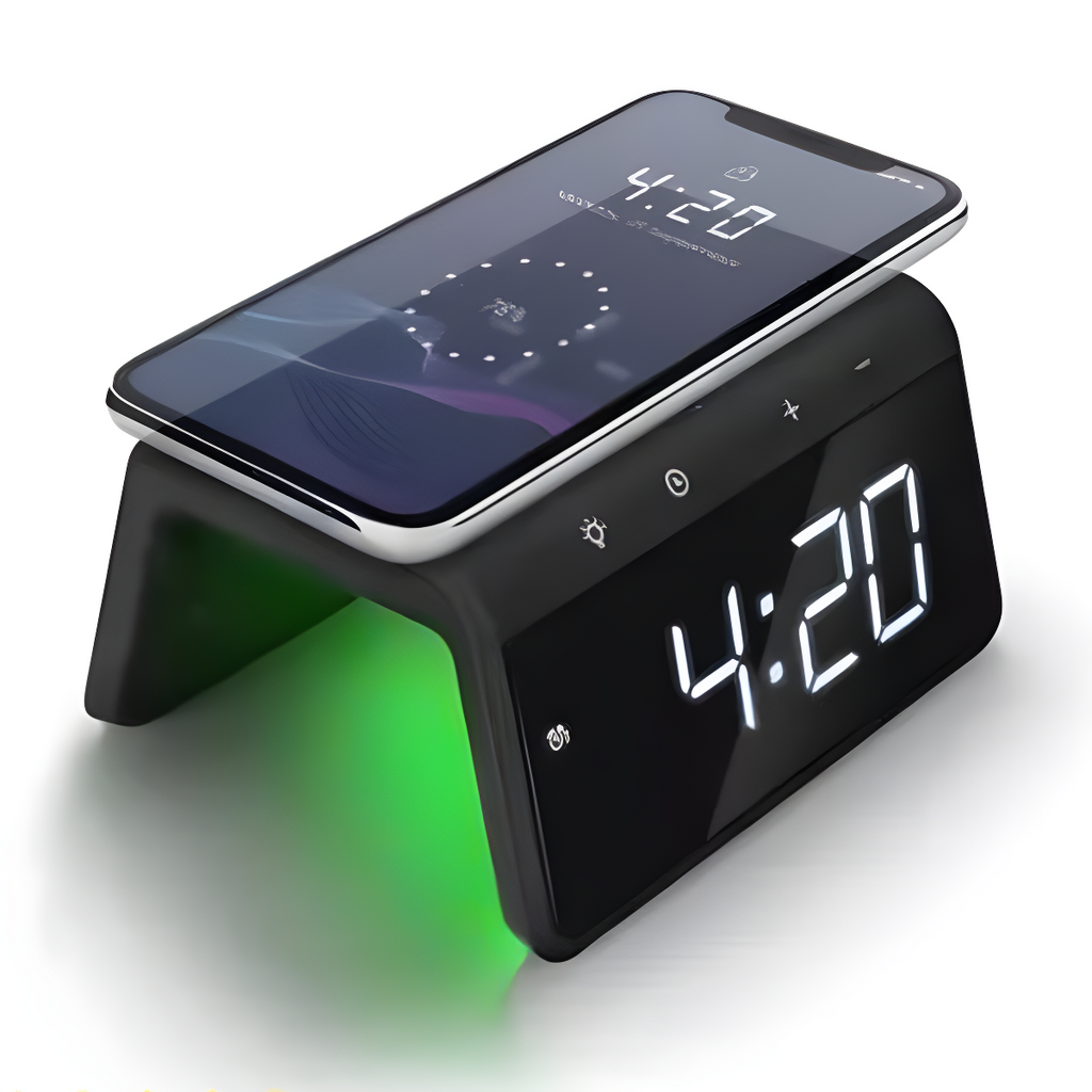 Chegou a nova base de carregamento sem fio com relógio digital, despertador e luminária. Ideal para quem busca praticidade e elegância, este produto multifuncional combina carregamento rápido, iluminação ajustável e funcionalidade em um só item. Perfeita para ser colocada na cabeceira da cama, no escritório ou até mesmo na cozinha, a base proporciona uma experiência completa e moderna.