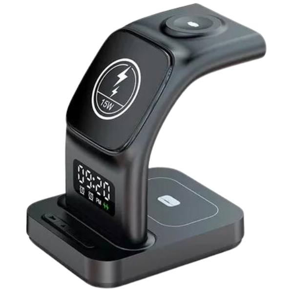 Apresentamos a nossa revolucionária Base Carregador Sem Fio 5 Em 1 Indução Relógio. Esta inovação multifuncional irá transformar suas manhãs e noites com um toque de elegância e praticidade.