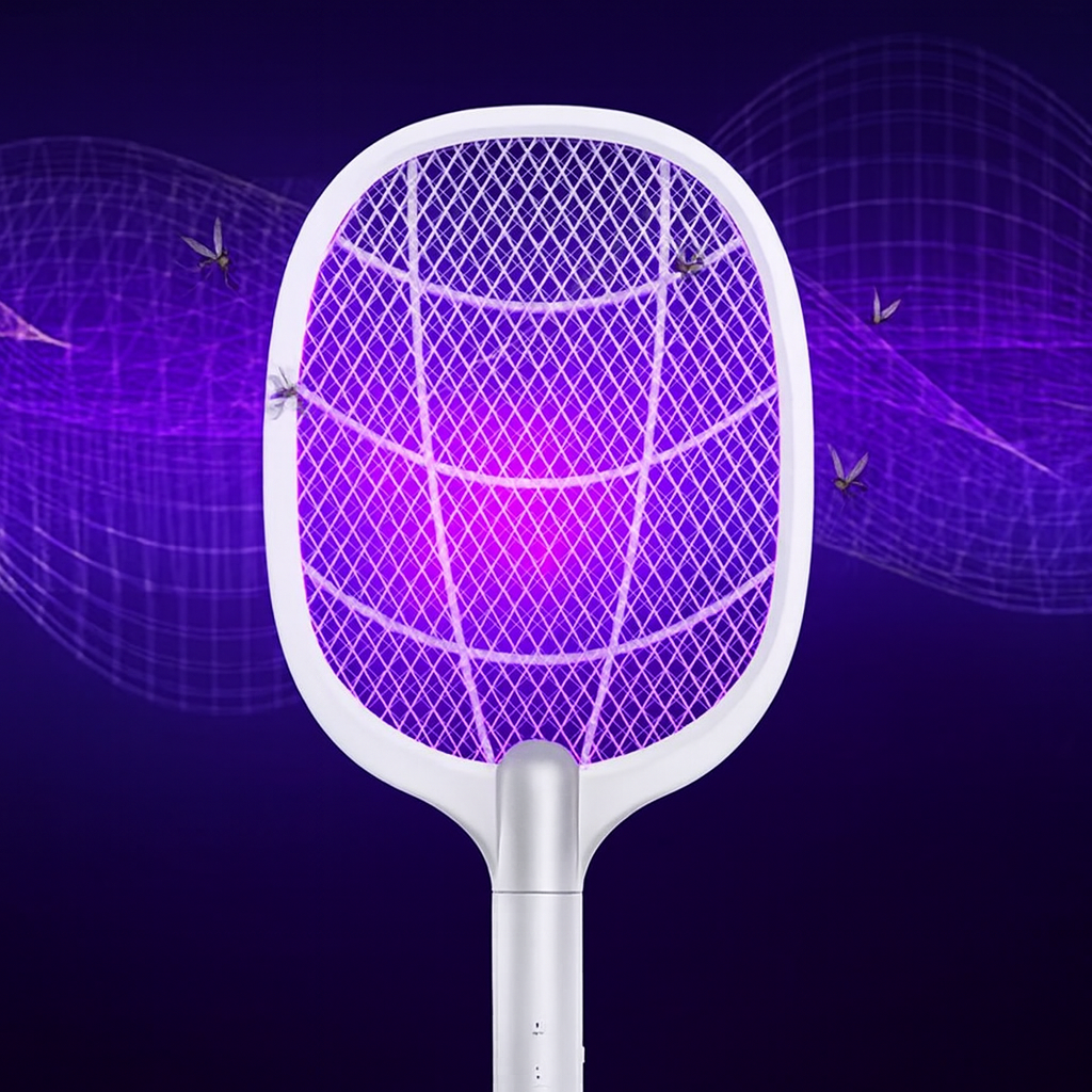 Raquete Elétrica Mata Insetos Recarregável C/ Base e Luz LED