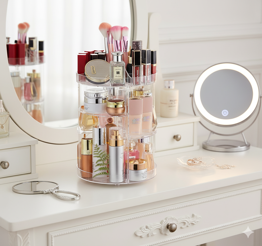 Organizador Giratório de Maquiagem e Cosméticos em Acrílico Transparente – Praticidade e Elegância para Seu Espaço de Beleza